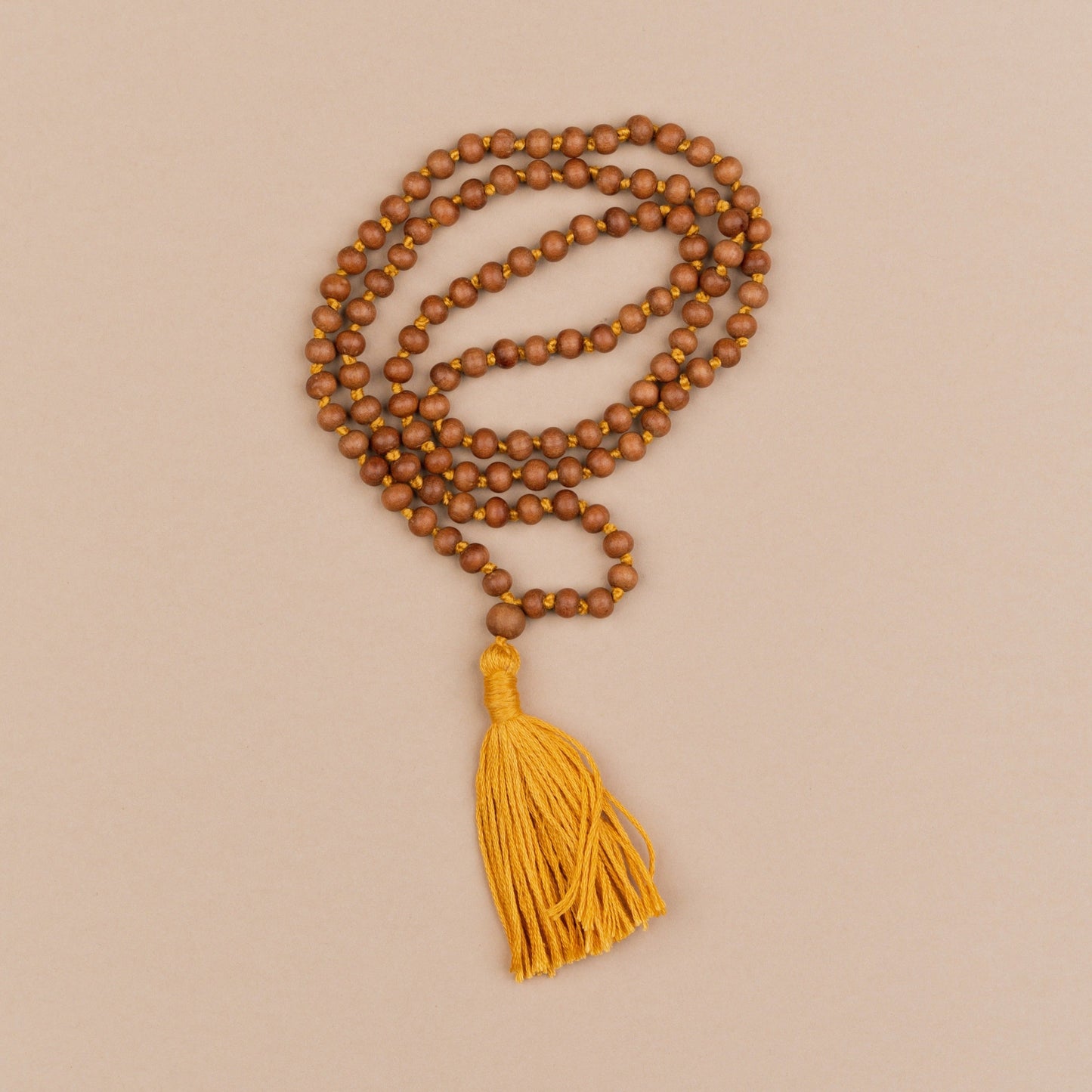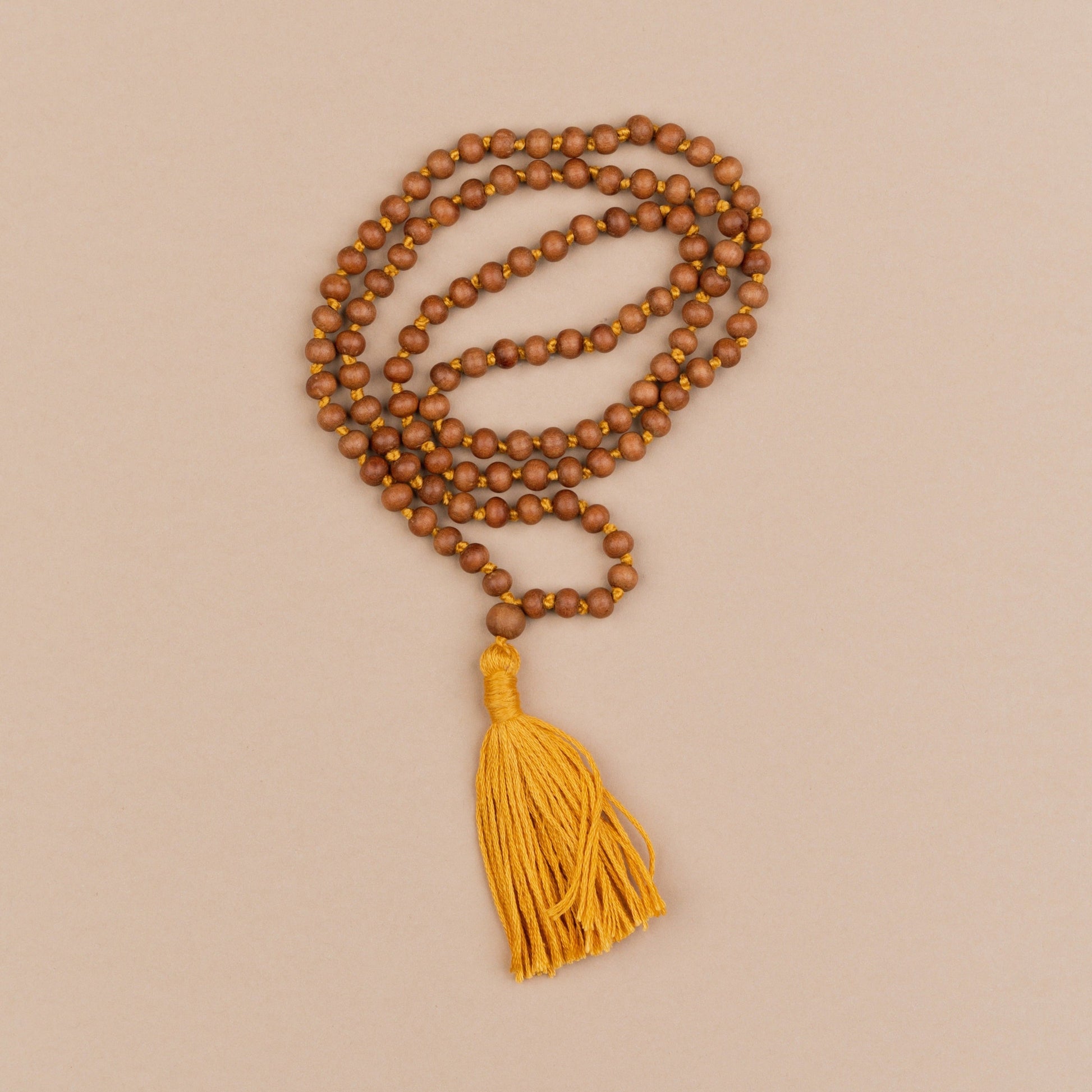 Each bead is carefully crafted by skilled artisans and hand-knotted to ensure durability and flexibility. Made from pure sandalwood, the mala's natural fragrance has a calming and grounding effect, enhancing your focus and concentration during your practice.